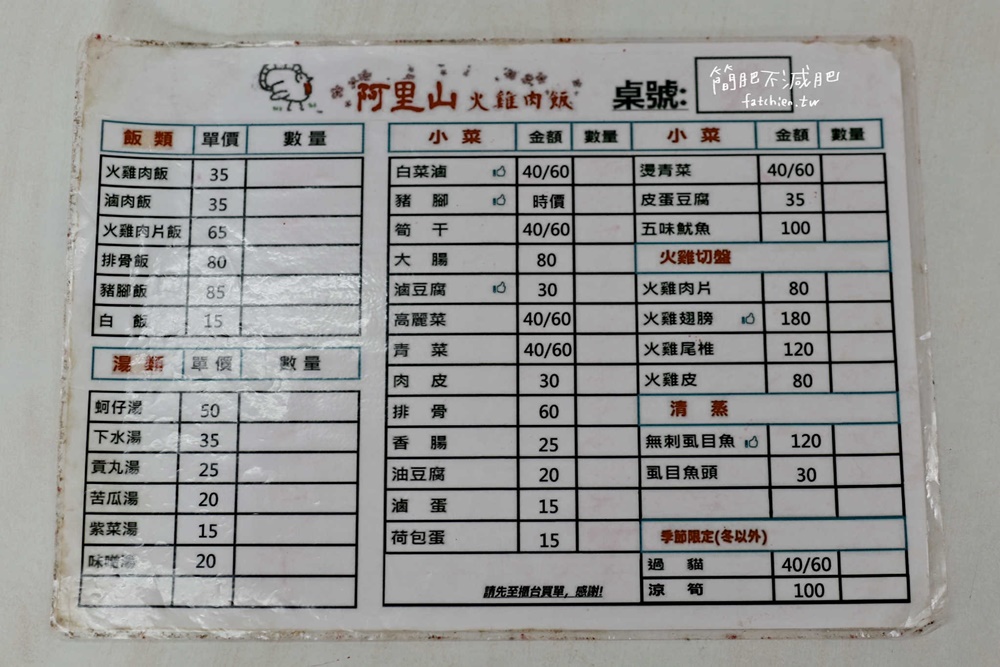 |嘉義|雞肉飯巡禮 #18|阿里山火雞肉飯-離市區遠一些的在地老店,火雞肉飯樸實卻有靈魂的雞油香,小菜滷豆腐軟嫩份量多,內用座位多,經濟實惠