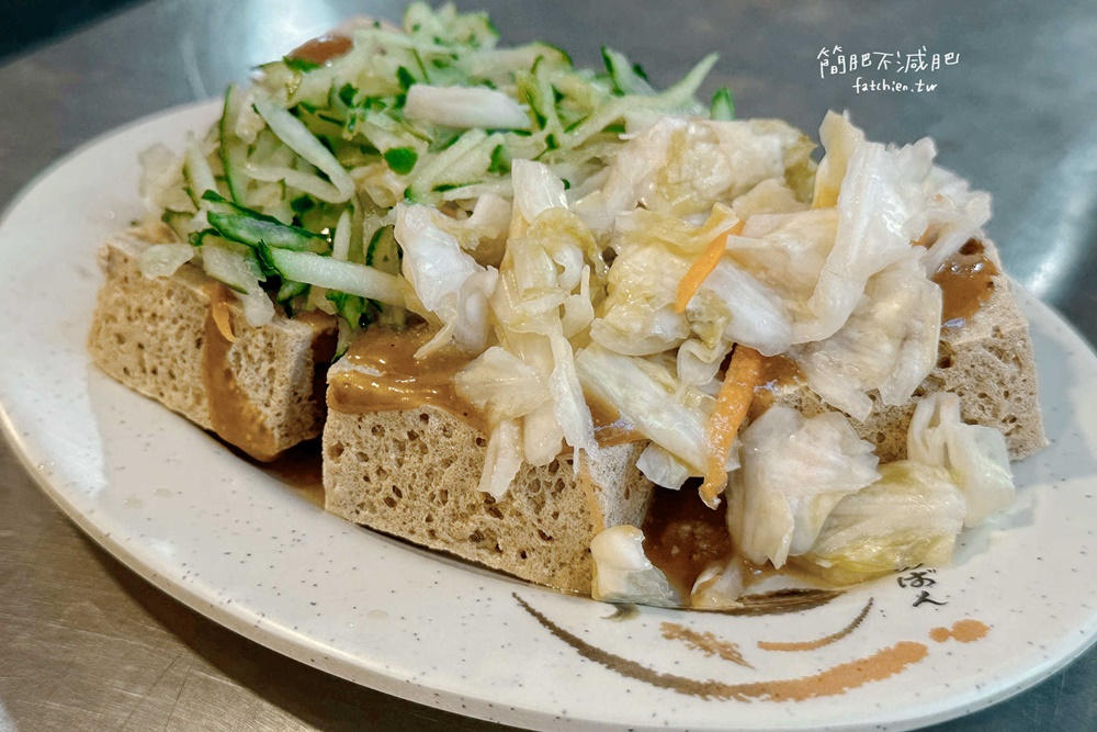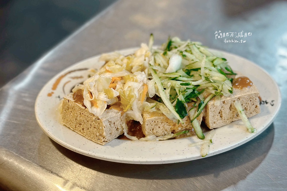 |南投 草屯|鬍鬚臭豆腐-台式泡菜配上小黃瓜絲,一份5塊蒜醬香濃,中藥泡製素食可吃