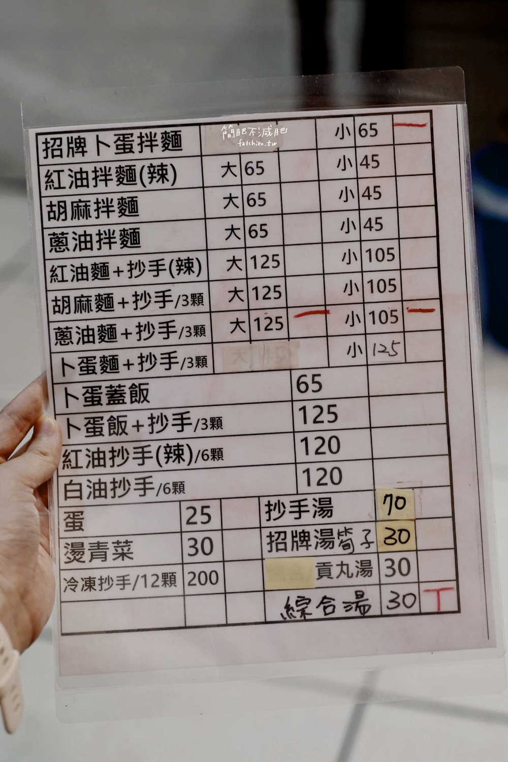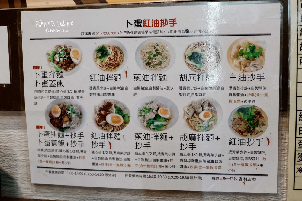 麵類有招牌卜蛋拌麵、紅油拌麵(辣)、胡麻拌麵及蔥油拌麵
