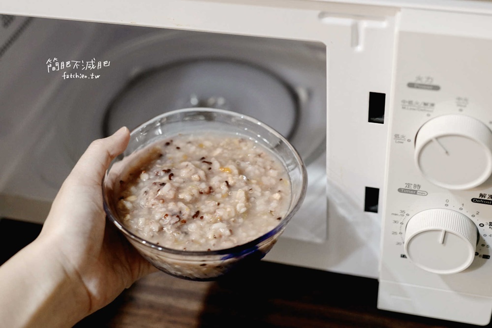 • 一樣先把粥品搖勻,裝到可微波的容器,加熱 2-3 分鐘即可;家裡沒有電鍋的我們,微波爐就是最佳夥伴
