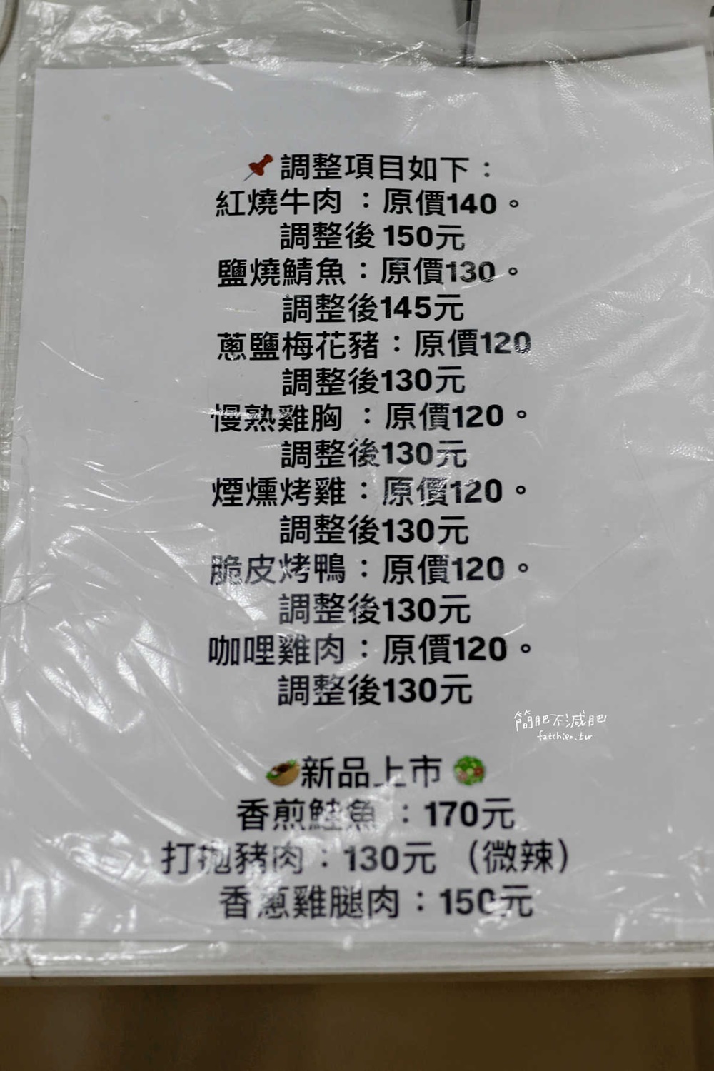櫃檯上還寫有三款新品:香煎鮭魚/打拋豬肉/香蔥雞腿肉