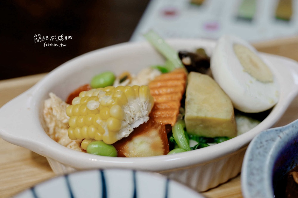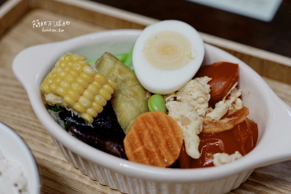 蔬菜種類豐富,上面一層有甜玉米、蒸地瓜、半顆水煮蛋、紅蘿蔔、毛豆跟番茄炒蛋