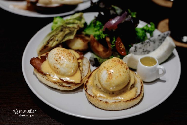 - 一邊是使用新鮮藍鑽蟹肉的自製馬鈴薯餅 / 另一個放豬培根 / 水波蛋 / 手打荷蘭醬 / 檸檬油醋沙拉 / 還有炒菇跟時蔬
