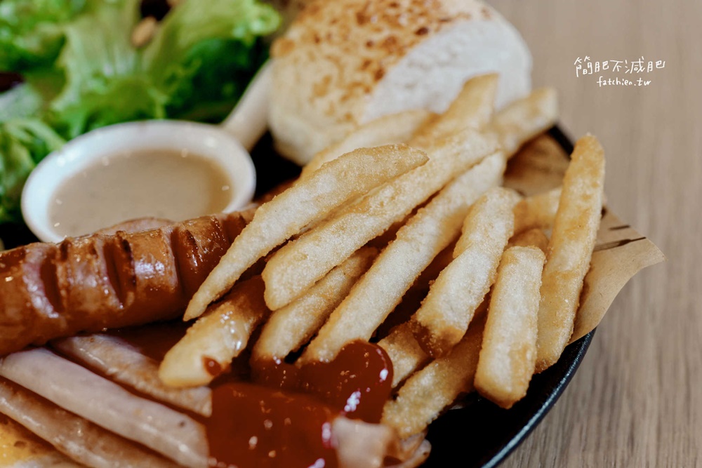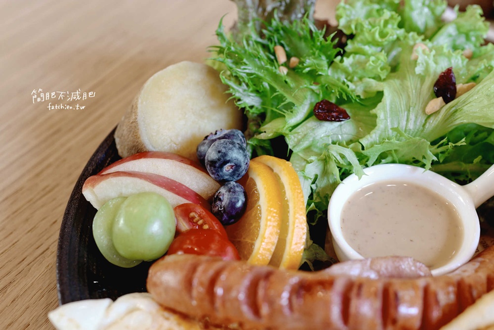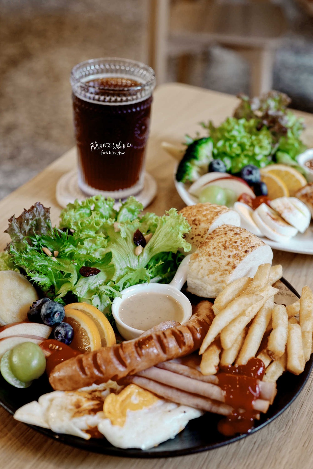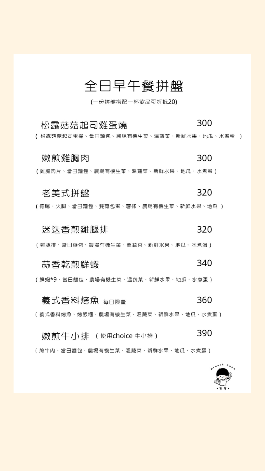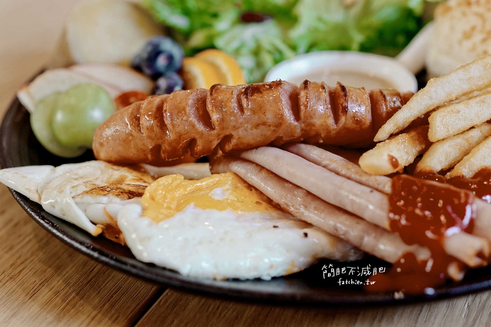 - 德腸、火腿、當日麵包、雙荷包蛋、薯條、農場有機生菜、新鮮水果、地瓜