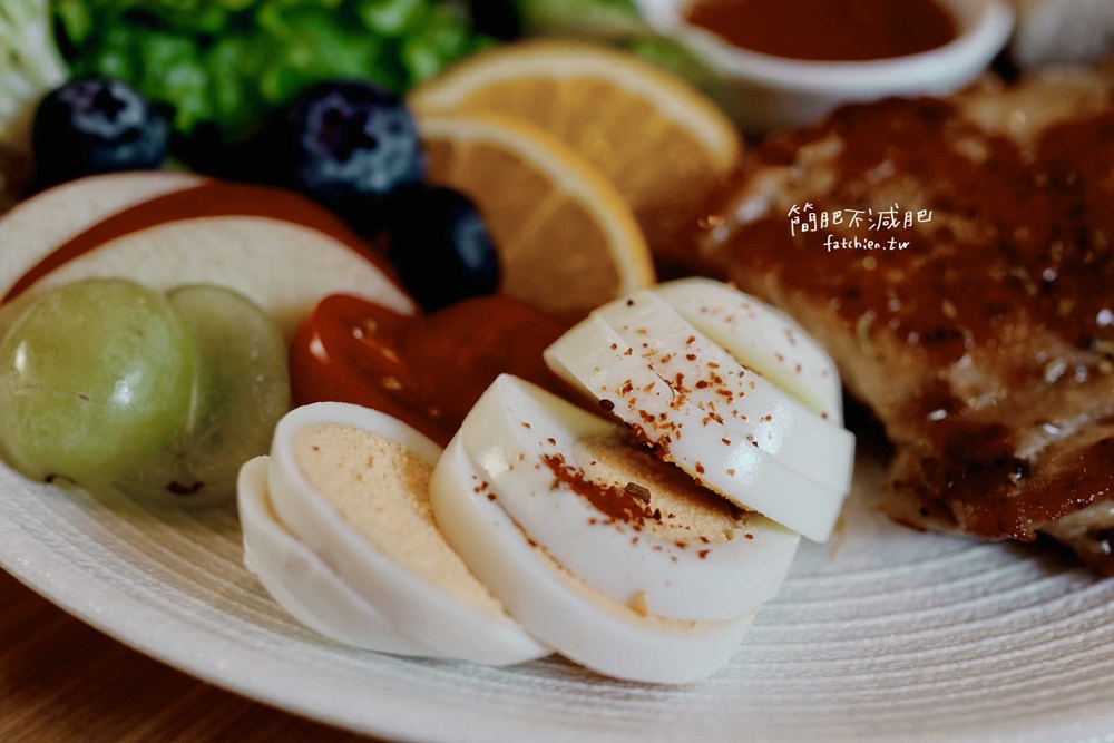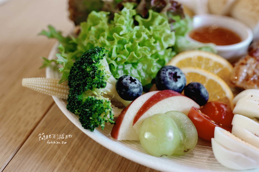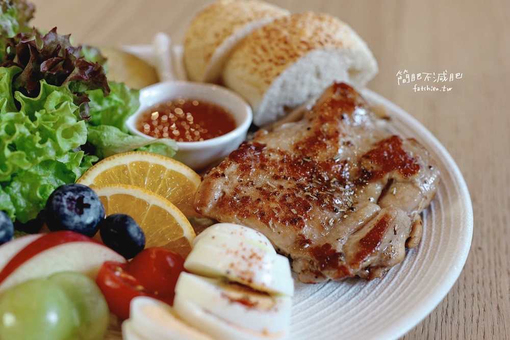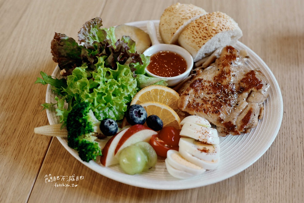 - 雞腿排、當日麵包、農場有機生菜、溫蔬菜、新鮮水果、地瓜、水煮蛋